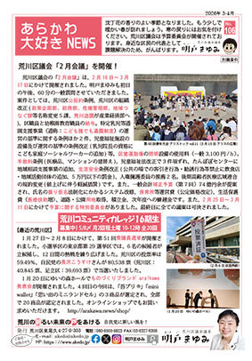 「あらかわ大好き NEWS」は、区議会や区内で起こったことをできるだけ新鮮なうちに、わかりやすく、区民の皆様にお届けしようと初当選以来、2ヶ月に1度発行しております。ご希望の方にはお送りもしていますので、お気軽にご連絡下さい。